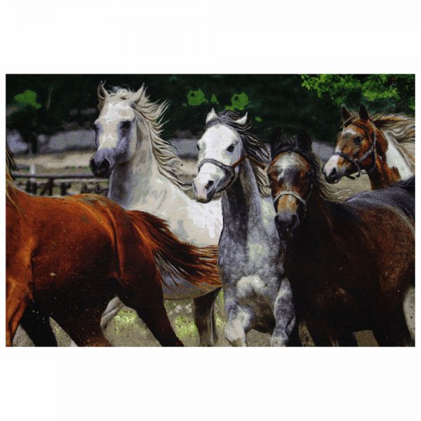 تابلو فرش دستباف گله اسب جنگل دارای 98 رنگ میباشد که 18 رنگ آن از ابریشم تهیه شده است.