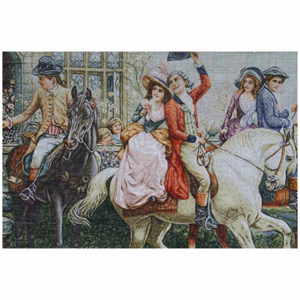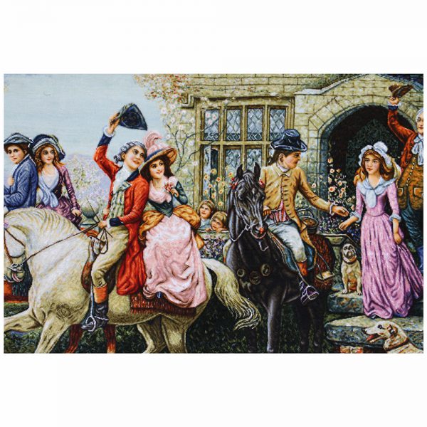 در این تابلو فرش دستباف تصاویر به قدری زیبا و واقعی در آمده اند که گویی تماشا کننده با نظاره این تابلو فرش به یک عروسی غربی دعوت شده است و هراه آنان مراسم بدرقه عروس را تماشا میکند . حتی اگر کمی دقت کنی و گوش جان به این اثر بسپاری میتوانی صدای پدر عروس که لب به دعای بدرقه گشوده است را بشنوی یا صدای رقص اسب های خوش خرامان یا با توجه بیشتر نوازش نسیم بهاری را روی صورتت میتوانی احساس کنی …