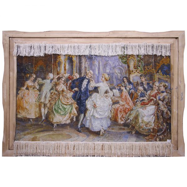 تابلو فرش رقص تالارنمایی از رقص عاشقانه عروس و داماد میباشد . در اطراف عروس و داماد زوج های دیگری را در حال رقص میبینیم همچنین در سمت چپ تابلوفرش گروه ارکست را میبینیم که با صدای ساز و آوازشان حس و حال شادی را به مجلس میبخشند .