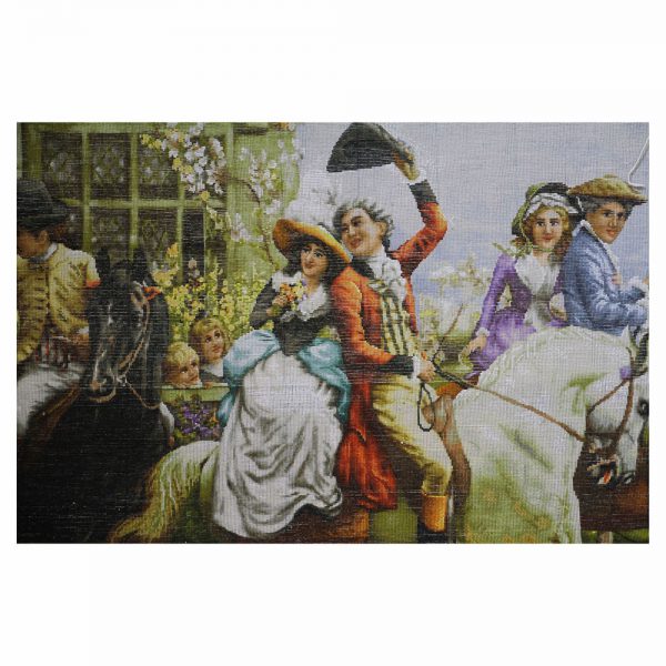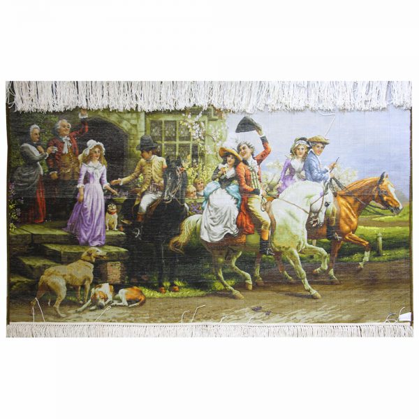 در این تابلو فرش دستباف تصاویر به قدری زیبا و واقعی در آمده اند که گویی تماشا کننده با نظاره این تابلو فرش به یک عروسی غربی دعوت شده است و هراه آنان مراسم بدرقه عروس را تماشا میکند . حتی اگر کمی دقت کنی و گوش جان به این اثر بسپاری میتوانی صدای پدر عروس که لب به دعای بدرقه گشوده است را بشنوی یا صدای رقص اسب های خوش خرامان یا با توجه بیشتر نوازش نسیم بهاری را روی صورتت میتوانی احساس کنی …