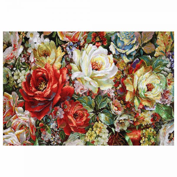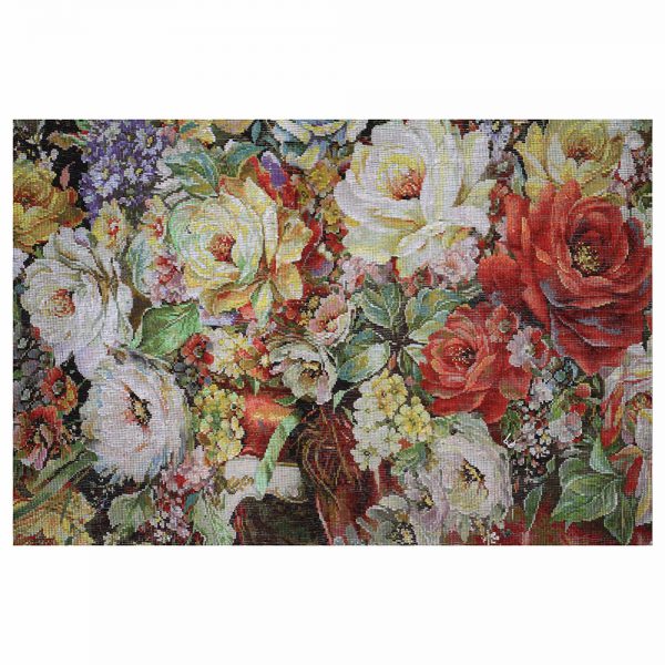 تابلوفرش دستباف سبد گل رز دارای 98 رنگ میباشد که 28 رنگ آن از ابریشم تهیه شده است.